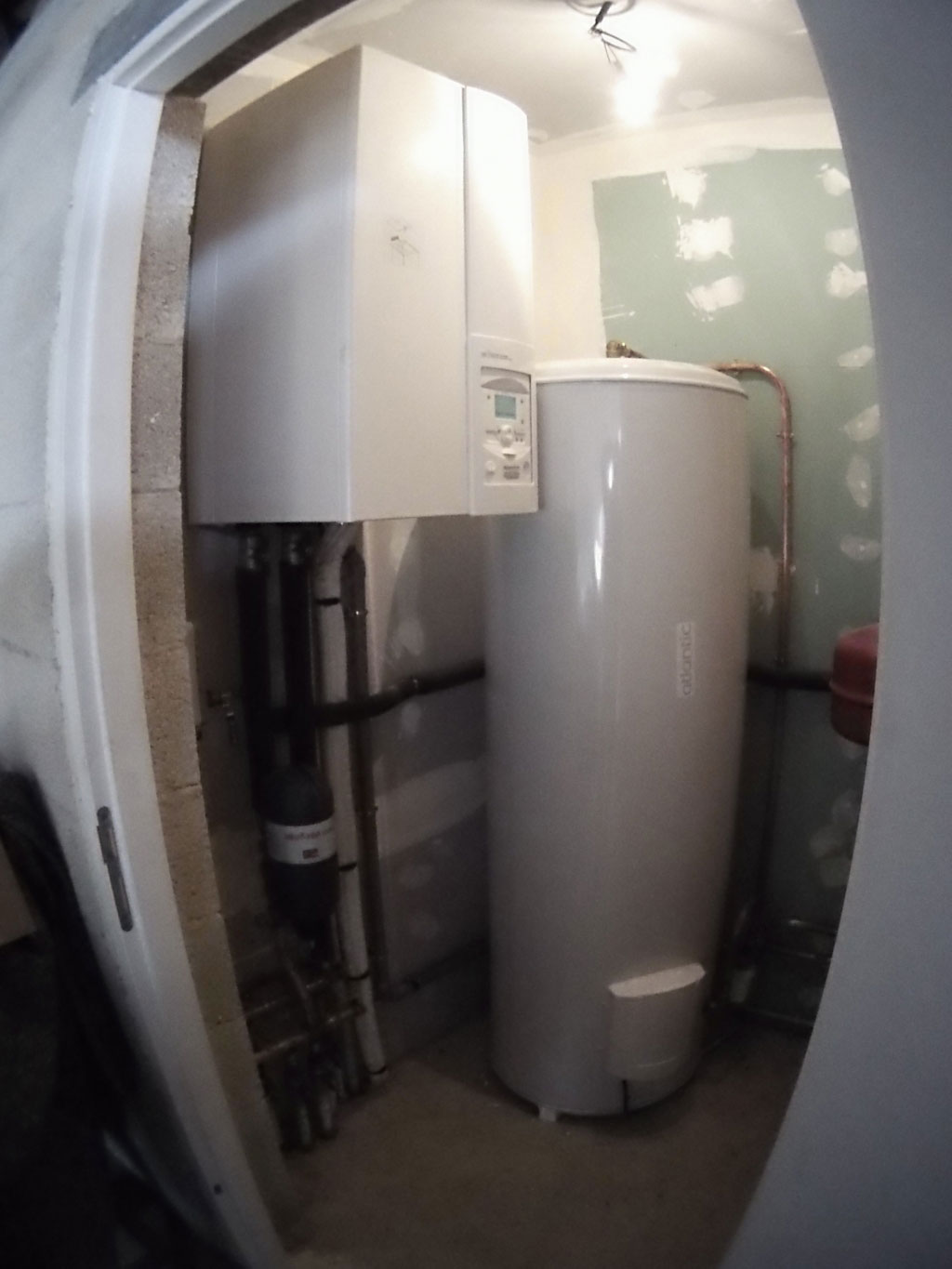 Pose d'une pompe à chaleur air eau Atlantic Alféa 16kw sur un plancher chauffant de 180m². Protection du circuit de plancher chauffant par un filtre Judo à Rétrolavage. L'installation est régulée en fonction de la température extérieure.